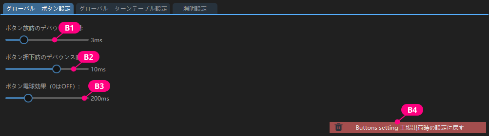 ボタンを離してからボタンライトが消えるまでの時間。通常は0~200ミリ秒が推奨されます。 |