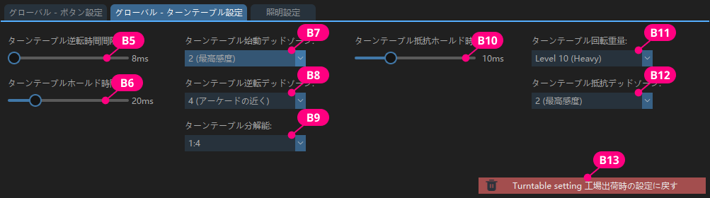 ターンテーブルの重さはグローバル設定です。お好みに応じて0~100の任意の値を入力できます。