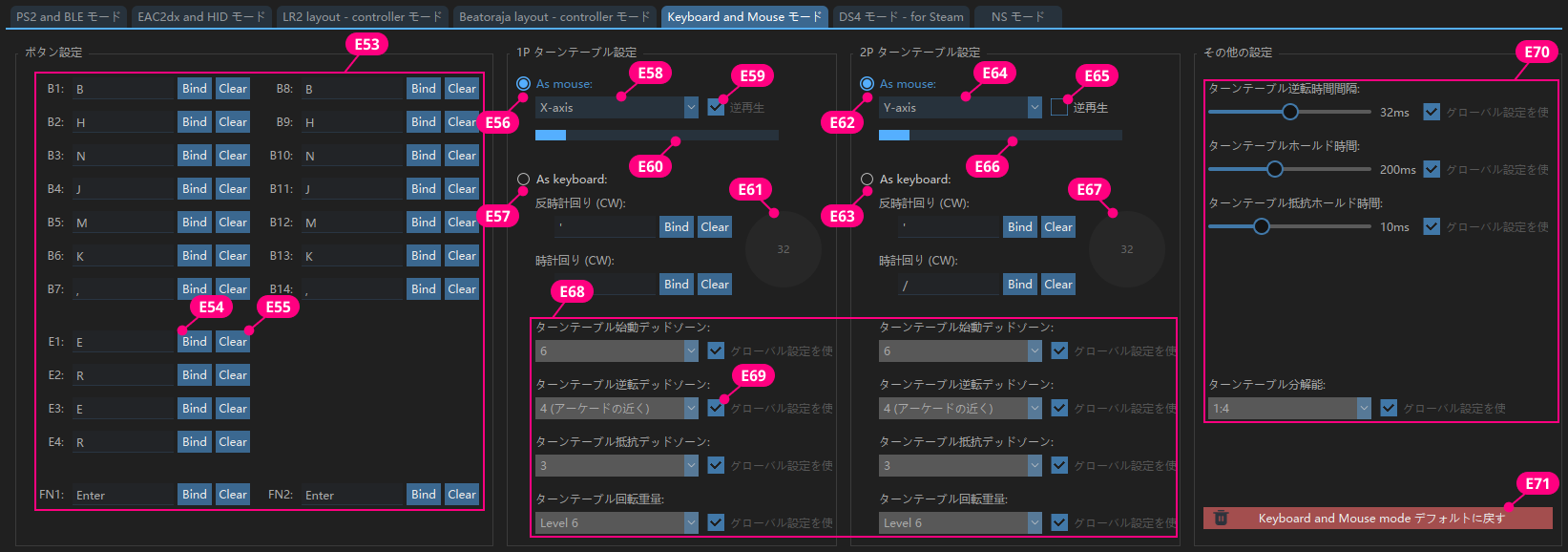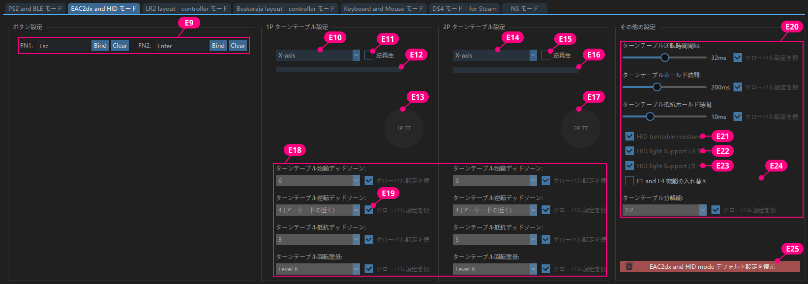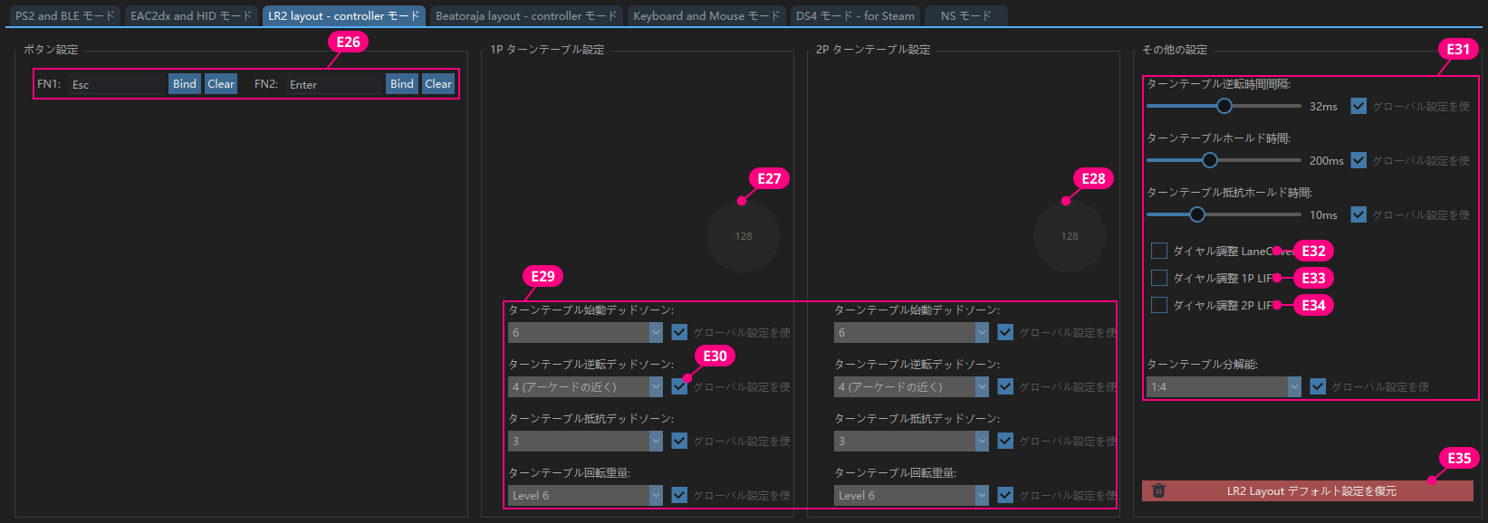チェックを入れると、E2 を押しながら 1P ターンテーブルを回して、1P LIFT を調整できます。 |